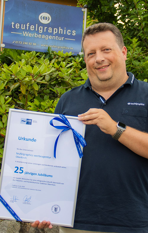 Kurz darauf hat teufelgraphics sein Leistungsspektrum um den Print-, Beschriftungs- und Multimedia- Bereich erweitern können. Mit dem Studium Medien und Informationswesen an der Hochschule Offenburg konnte Simon Teufel seine Kompetenzen in den Bereichen Marketing, Gestaltung und Informationstechnik weiterentwickeln.