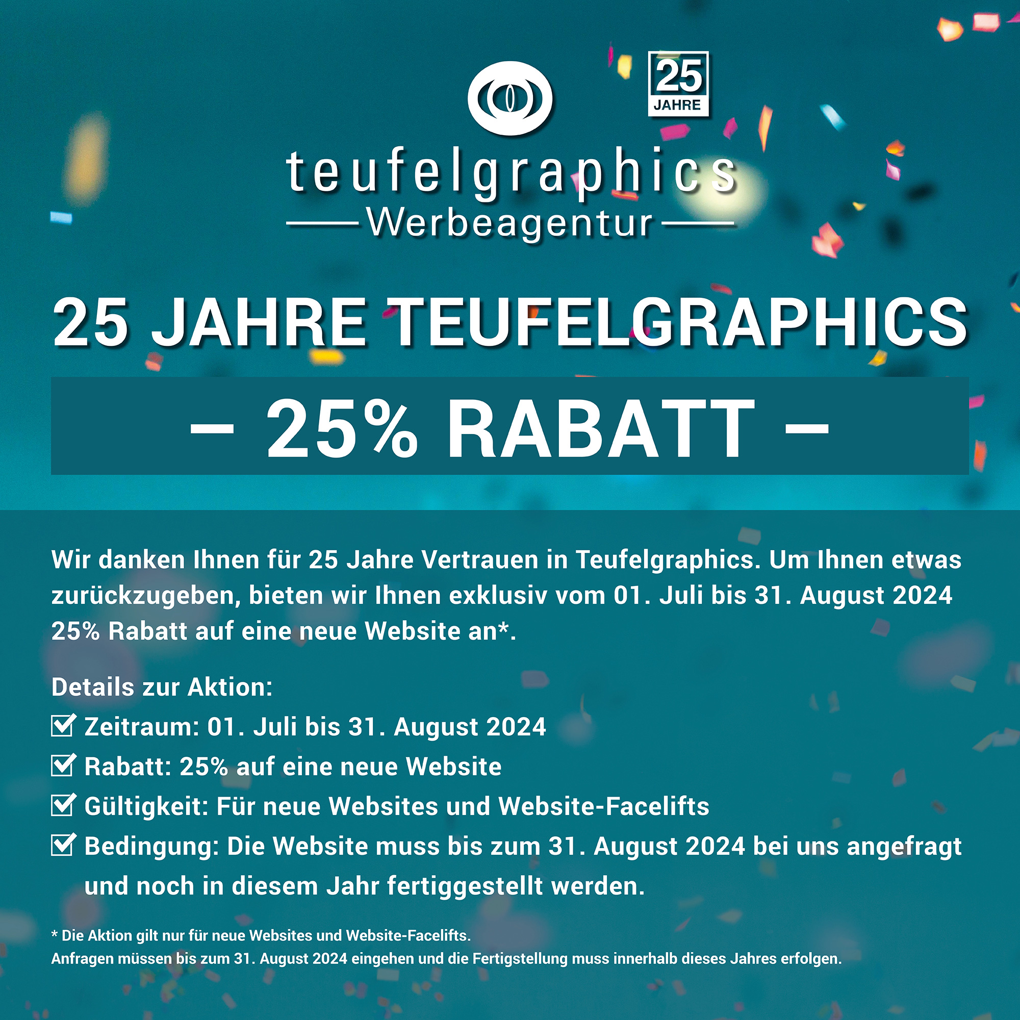 Wir sagen danke mit 25% RabattWir danken Ihnen für 25 Jahre Vertrauen in Teufelgraphics. Um Ihnen etwas zurückzugeben, bieten wir Ihnen exklusiv vom 01. Juli bis 31. August 2024 25% Rabatt auf eine neue Website an*. Details zur Aktion: