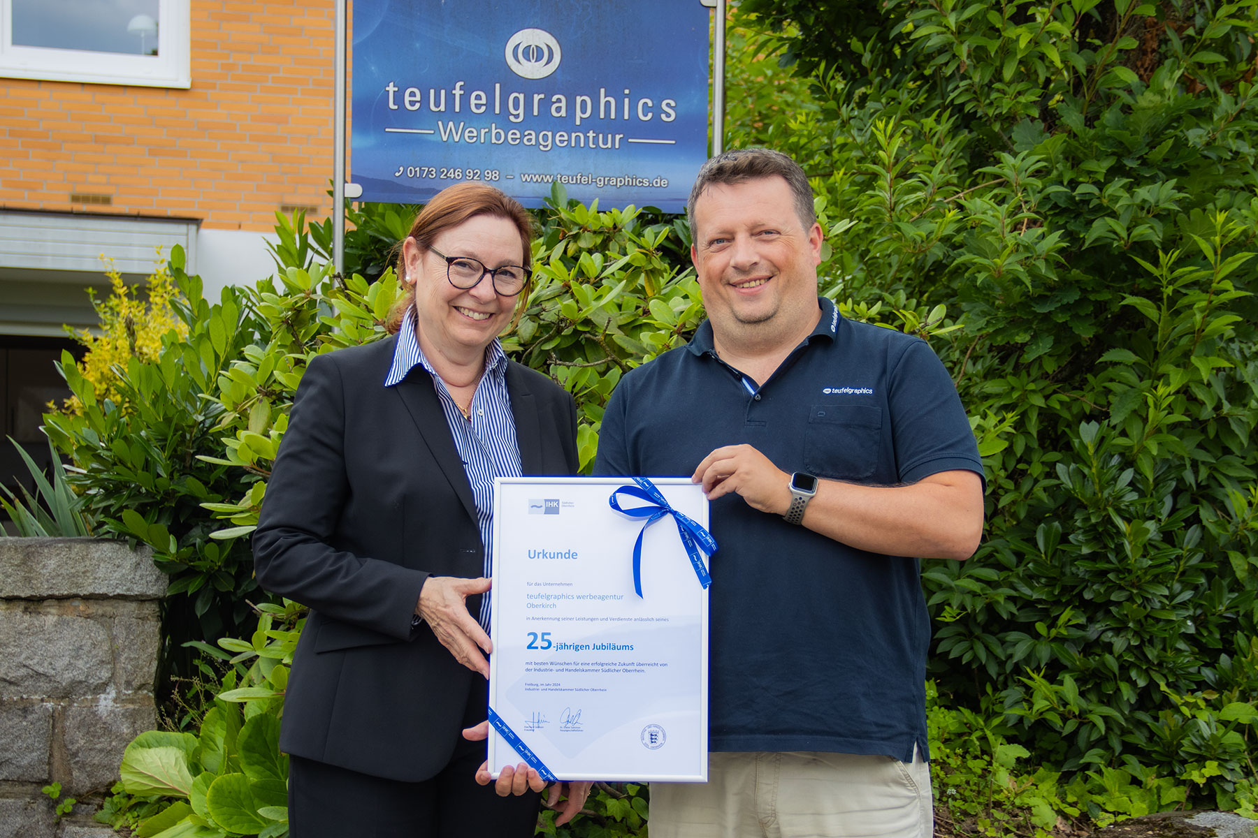 25 Jahre TeufelgraphicsDie 1998 von Simon Teufel gegründete Werbeagentur feiert in diesem Jahr ihr 25-jähriges Jubiläum. Aus diesem Anlass haben wir am Montag, den 10. Juni 2024, eine Urkunde von Pascale Mollet-Piffert, der Leiterin der Stabsstelle für grenzüberschreitende Zusammenarbeit, erhalten. Unser besonderer Dank gilt unseren Kunden, die maßgeblich zu unserem Erfolg beigetragen haben. In den letzten 25 Jahren hat sich viel getan und die Agentur hat einige bedeutende Meilensteine erreicht. So betreuen wir heute aktiv über 100 Kundenfirmen und haben bisher drei Auszubildende erfolgreich ausgebildet. Unsere Kunden sind in der gesamten Ortenau verteilt, und auch überregional betreuen wir die Websites mehrerer Schweizer Weingüter.